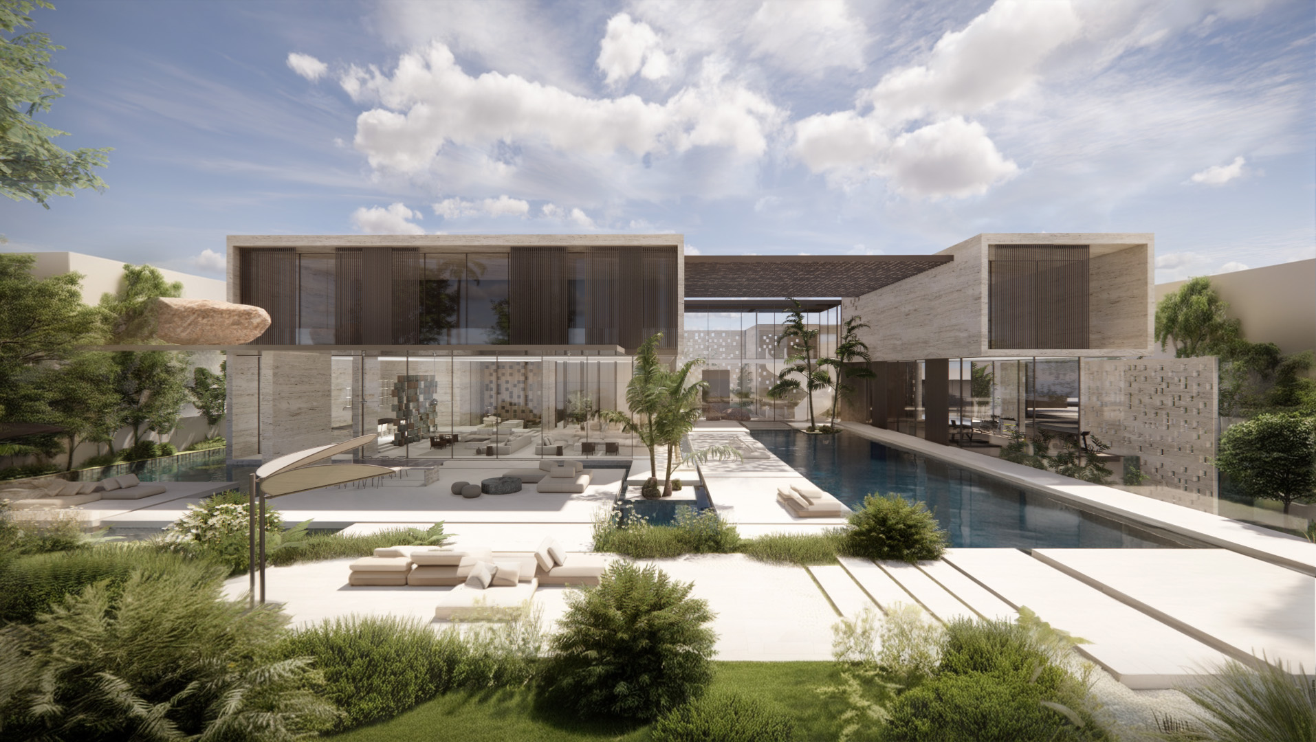 The design includes three levels with the suites positioned on the top floor, including a separated area for the primary suite for maximum privacy. The ground floor includes generous entertainment and dining areas, gym, spa and an office. The basement includes a cinema, wine cellar and a large playroom that is surrounded by patios and a plunge pool.