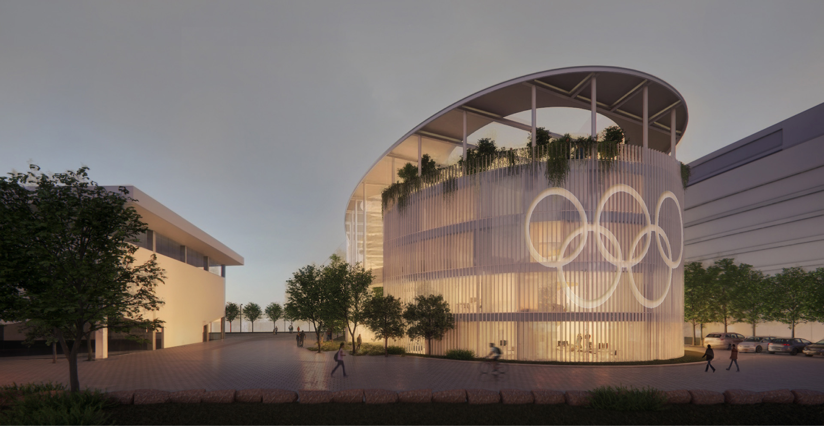The design is sculpted within an oval plan with several round cutouts, referencing the Olympic rings and creating connections within the building to maximize accessibility and inclusivity.